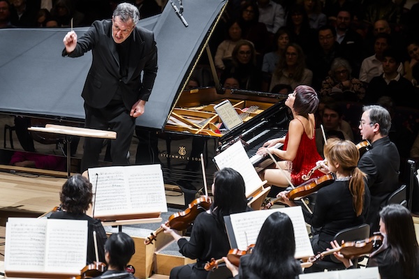 Next the program turned from an almost-concerto to a kind of über-concerto, Rautaavara’s Piano Concerto No. 1. Composing in 1969, the high noon of musical serialism, the Finnish composer rejected that school’s brainy asceticism in favor of the swashbuckling tradition of Liszt and Rachmaninoff. And how better to convey this modernist take on the old masters than with the sweeping, vivid pianism of Yuja Wang?